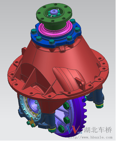 新能源客車主減總成為單級減速結(jié)構(gòu),由主減速器殼、左右差速器殼、軸承座、主從動(dòng)錐齒輪、行星齒輪、半軸齒輪、十字軸、突緣總成、主動(dòng)錐齒輪油封總成、軸承等零部件組成,扭矩大、傳動(dòng)效率高