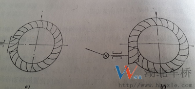 三種齒形橫斷面的齒廓在齒高方向都是漸開線齒形,其宏觀特征的主要區(qū)別是: 圓弧齒錐齒輪與等高齒錐齒輪,其主從動錐齒輪軸線都是相交的,二者不同的是沿齒長方向,前者由大端到小端是逐漸縮小的,而后者在全齒長上齒高是相等的(如圖a)。雙曲面齒輪的主要特征是主從動齒輪軸線不相交,主動齒輪低于從動齒輪一個距離,其主從動齒輪的螺旋角度大(如圖b)。雙曲面齒輪的最大優(yōu)點是同時嚙合的齒數(shù)多,傳動平穩(wěn)性好、強度大、噪音小;缺點是嚙合齒面滑動速度大,因而對潤滑油的要求高,必須使用專門的雙曲面齒輪油,且對調(diào)整精度要求高。另外因主從動齒輪的螺旋角大,工作時軸向力大,容易發(fā)生軸向串動。因此在實際生產(chǎn)過程中大多數(shù)使用前兩種主從動齒輪
